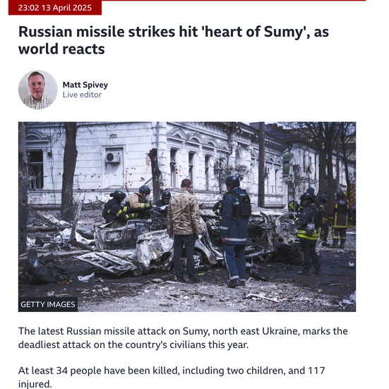 13 квітня 2025 року, у Вербну неділю, центр Сум став місцем однієї з найстрашніших трагедій за час повномасштабної війни. Загинуло — 35 людей, поранено —125.